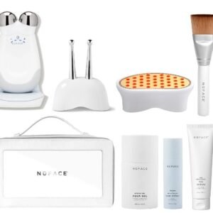 „NuFACE Trinity“ rinkinys (JAV): ELLE masažuoklio antgalis, LED antgalis, kosmetikos krepšys, gelis, kremas, serumas ir mikrosrovių veido terapijos aplikatorius